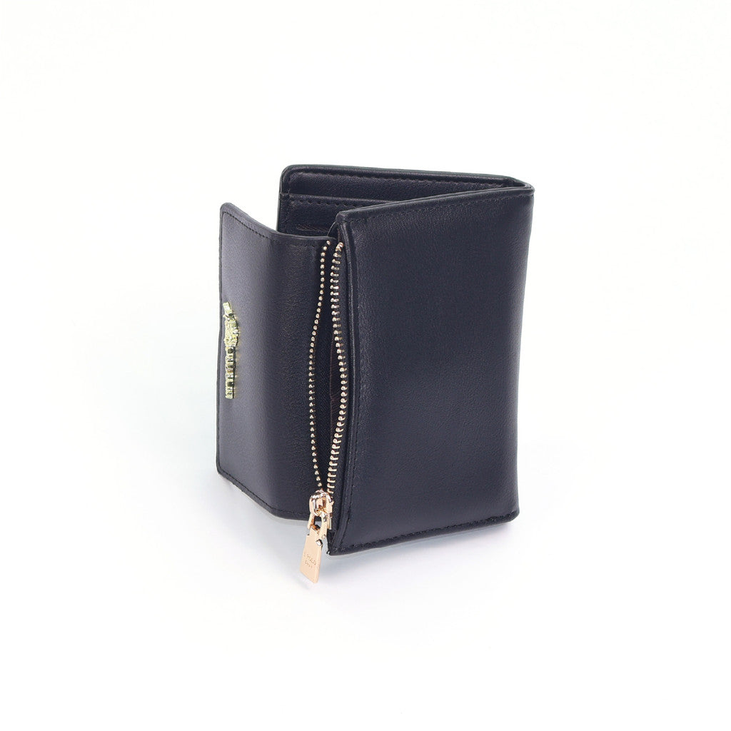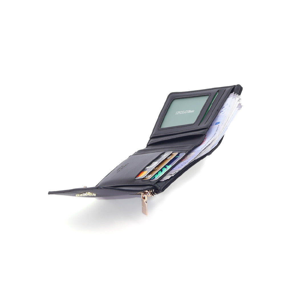 Features: TriFold, Snap Button Flap Closure, 4 Card Slots with 1 Window Card Slot, 4 Inner Pocket Compartments, 1 Bill Compartment, Zipper Pocket Compartment