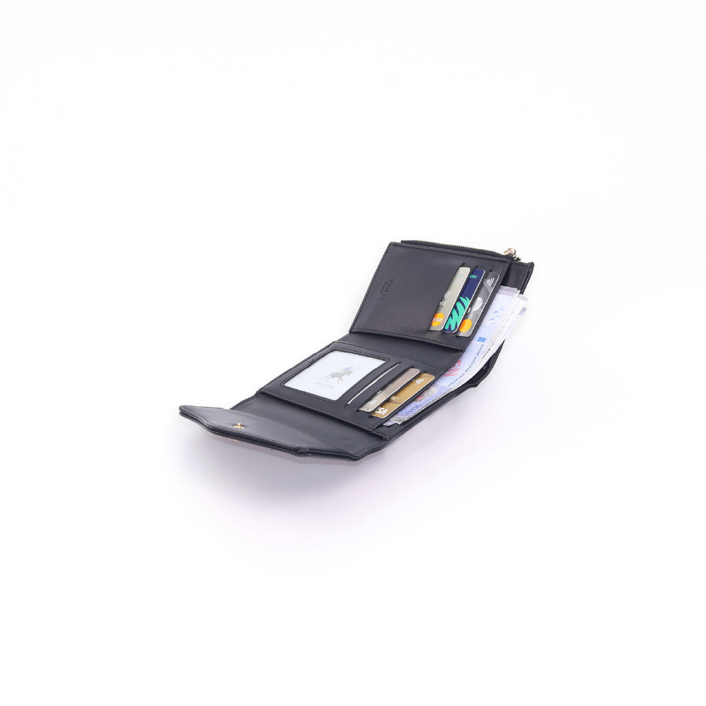 Features: Tri-Fold, Snap Button Closure, Zipper Pocket Compartment, Double Inner Pocket Compartments, 5 Card Slots with 1 Window Card Slot, 1 Bill Compartment
